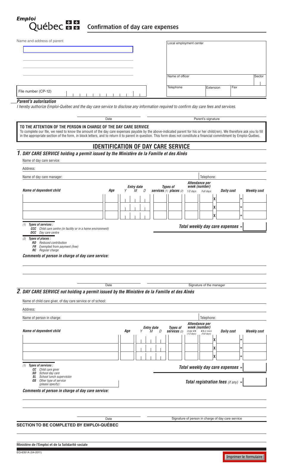 Form Eq 6351a Download Fillable Pdf Or Fill Online Confirmation Of Day Care Expenses Quebec Canada Templateroller